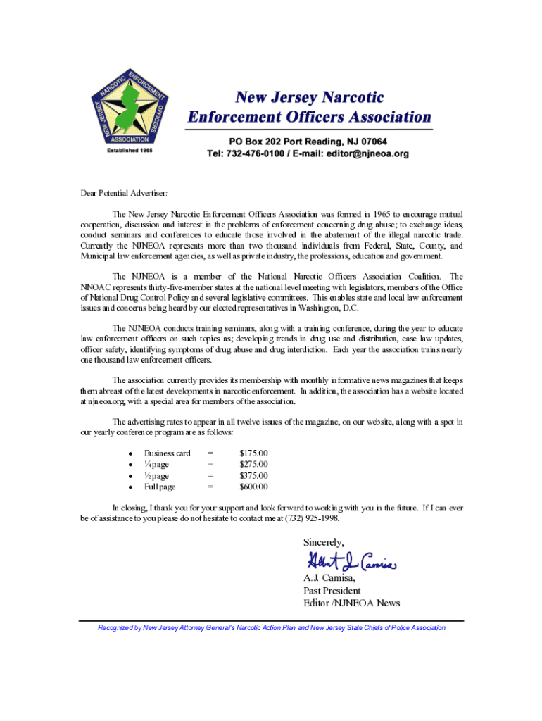 Dear Potential Advertiser: The New Jersey Narcotic Enforcement Officers Association was formed in 1965 to encourage mutual cooperation, discussion and interest in the problems of enforcement concerning