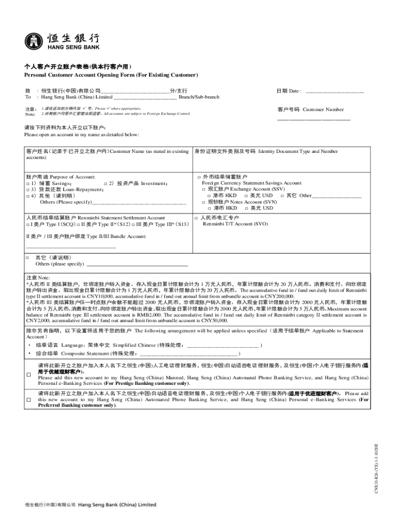 () Personal Customer Account Opening Form (For Existing Customer) To: ()___/ : Hang Seng Bank (China) Limited ___ Branch/Subbranch 1. Please where appropriate. Note: 2. All accounts are subject to