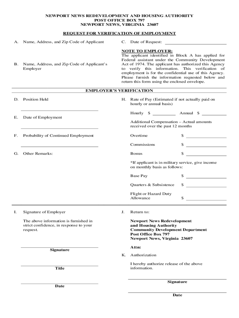 NEWPORT NEWS REDEVELOPMENT AND HOUSING AUTHORITY POST OFFICE BOX 797 NEWPORT NEWS, VIRGINIA 23607 REQUEST FOR VERIFICATION OF EMPLOYMENT A.B. Name, Address, and Zip Code of Applicants. Date of Request:Name,