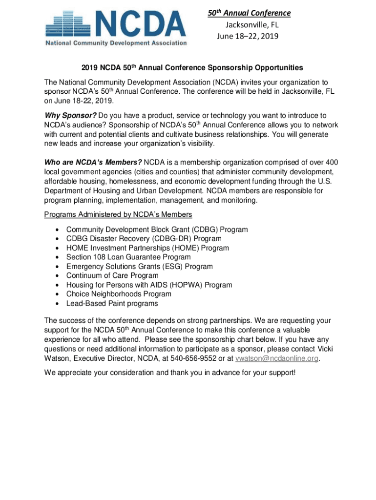 50th Annual Conference Jacksonville, FL June 1822, 20192019 NCAA 50th Annual Conference Sponsorship Opportunities The National Community Development Association (NCAA) invites your organization to