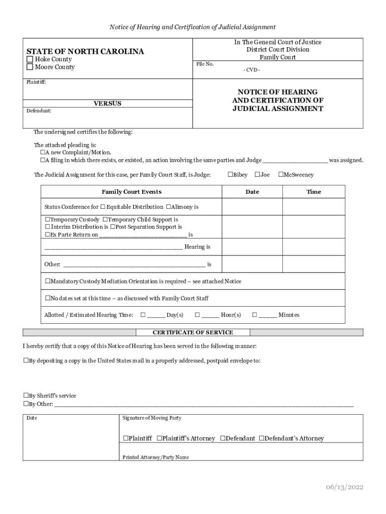 Notice of Hearing and Certification of Judicial Assignment In The General Court of Justice District Court Division Family Coruscate OF NORTH CAROLINA Hoke County Moore Countywide No. CVD Plaintiff:Defendant:NOTICE