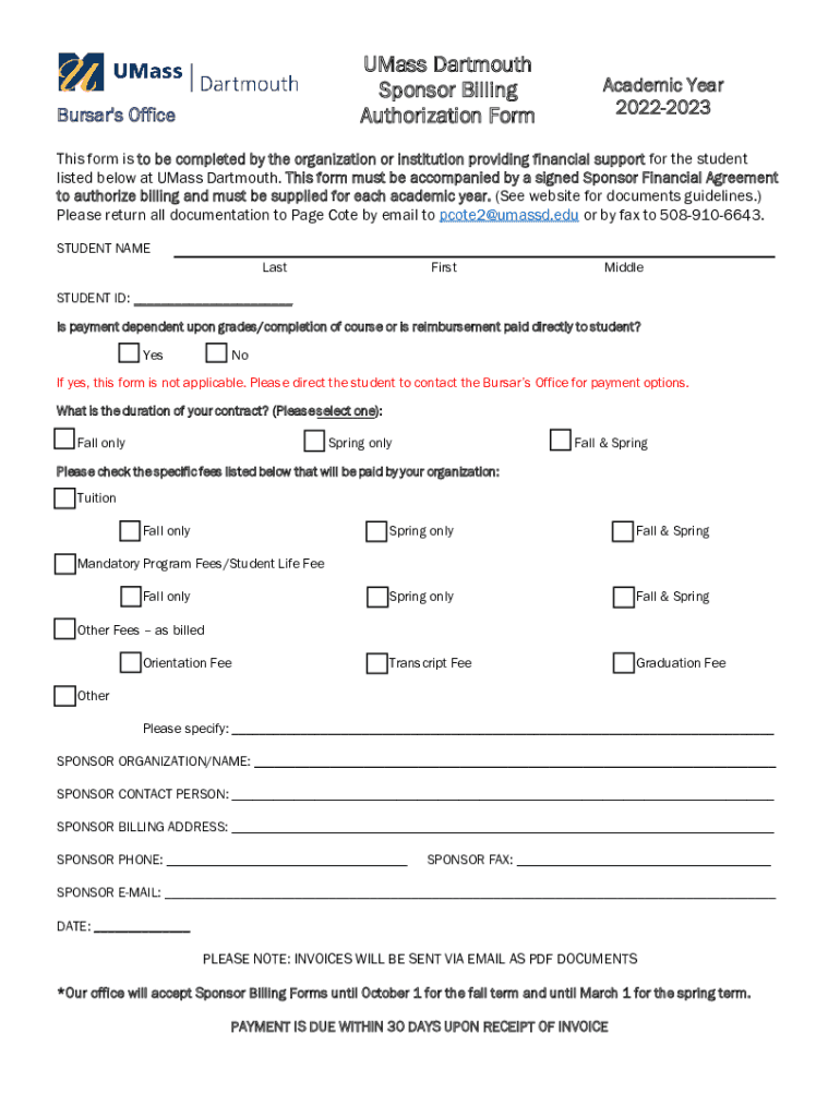 Mass Dartmouth Sponsor Billing Authorization FormBursar\'s OfficeAcademic Year 20222023This form is to be completed by the organization or institution providing financial support for the student listed
