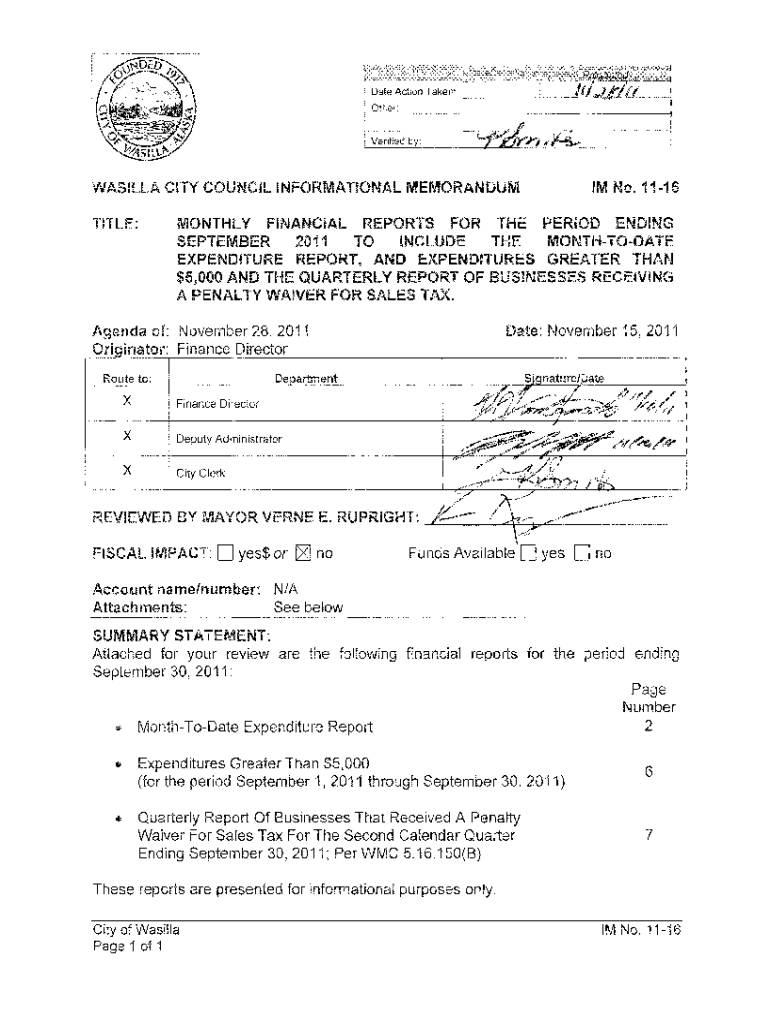 Date Action Taken: Other:VANILLA CITY COUNCIL INFORMATIONAL MEMORANDUM No. 1116MONTHLY FINANCIAL REPORTS FOR THE PERIOD ENDING SEPTEMBER 2011 TO INCLUDE THE MONTHTODATE EXPENDITURE REPORT, AND EXPENDITURES