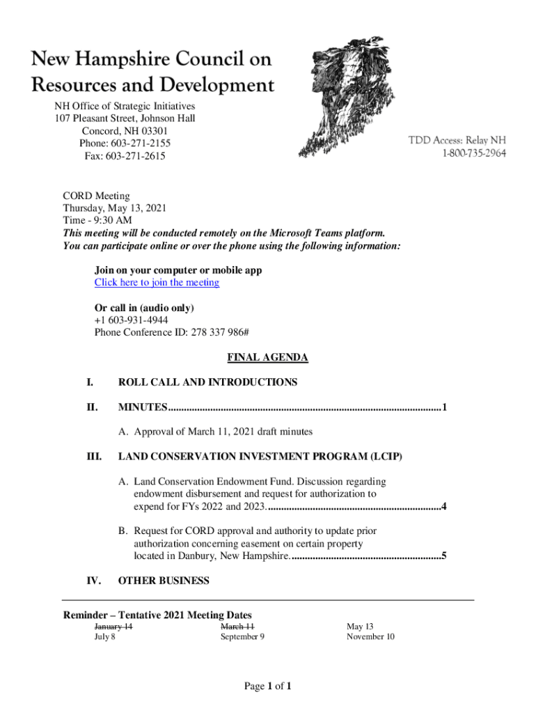 NH Office of Strategic Initiatives 107 Pleasant Street, Johnson Hall Concord, NH 03301 Phone: 6032712155 Fax: 6032712615CORD Meeting Thursday, May 13, 2021, Time 9:30 AM This meeting will be conducted