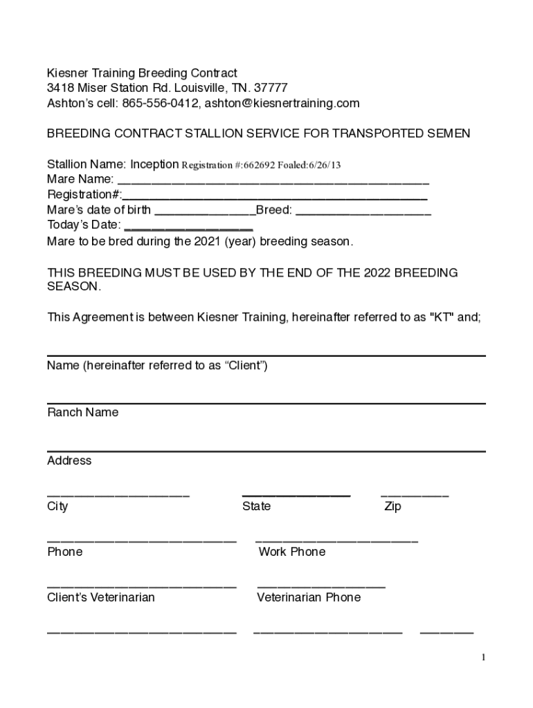 Kaiser Training Breeding Contract 3418 Miser Station Rd. Louisville, TN. 37777 Ash tons cell: 8655560412, ashton@kiesnertraining.com BREEDING CONTRACT STALLION SERVICE FOR TRANSPORTED SEMEN Stallion