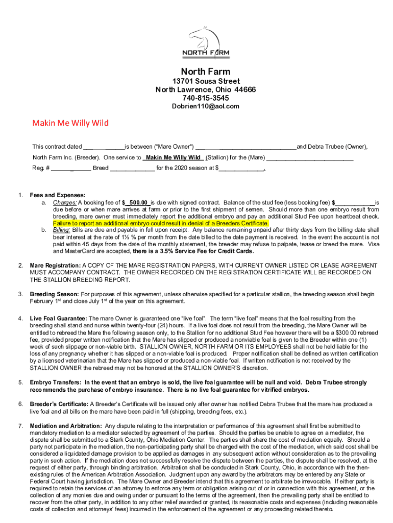 North Farm13701 Sousa Street North Lawrence, Ohio 44666 7408153545 Dobrien110@aol.comMakin Me Willy Wild This contract dated ______is between (Mare Owner\”) ______and Debra True (Owner), North Farm