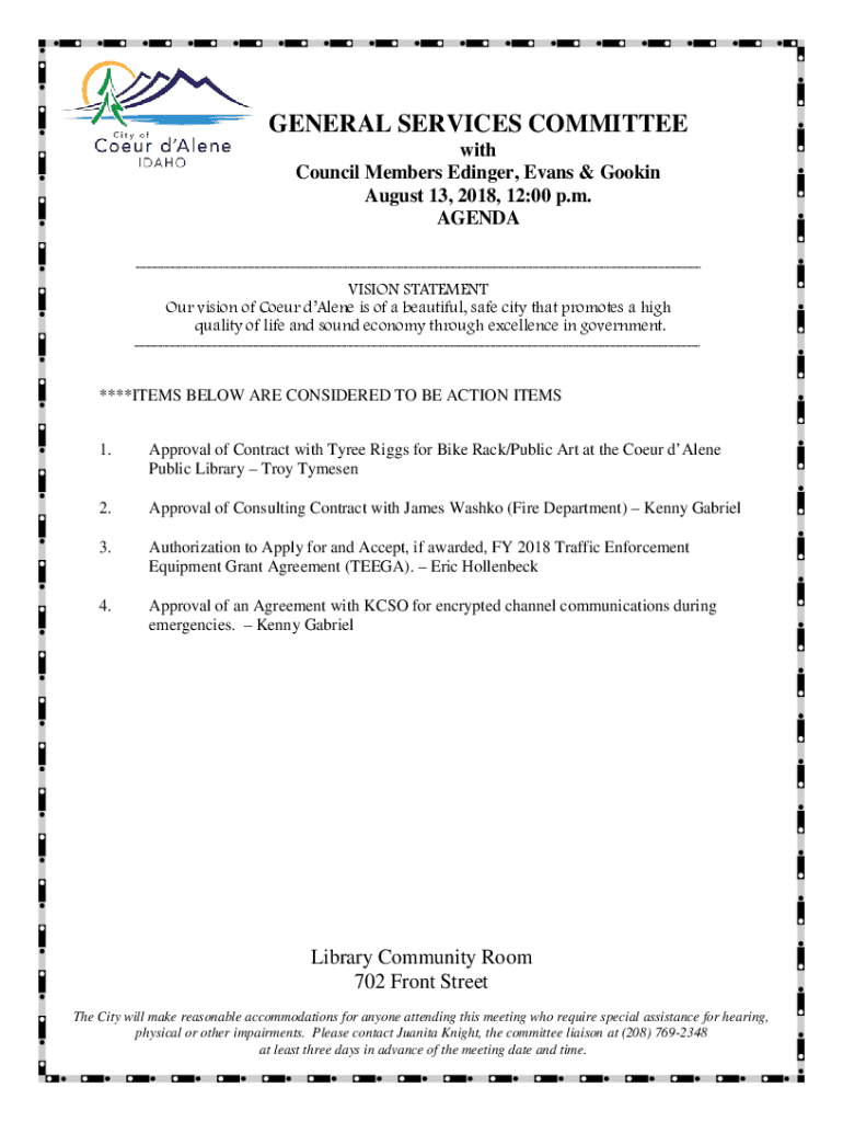 GENERAL SERVICES COMMITTEE with Council Members Singer, Evans & Goo kin August 13, 2018, 12:00 p.m. WandaVision STATEMENT Our vision of Four Darlene is of a beautiful, safe city that promotes a high