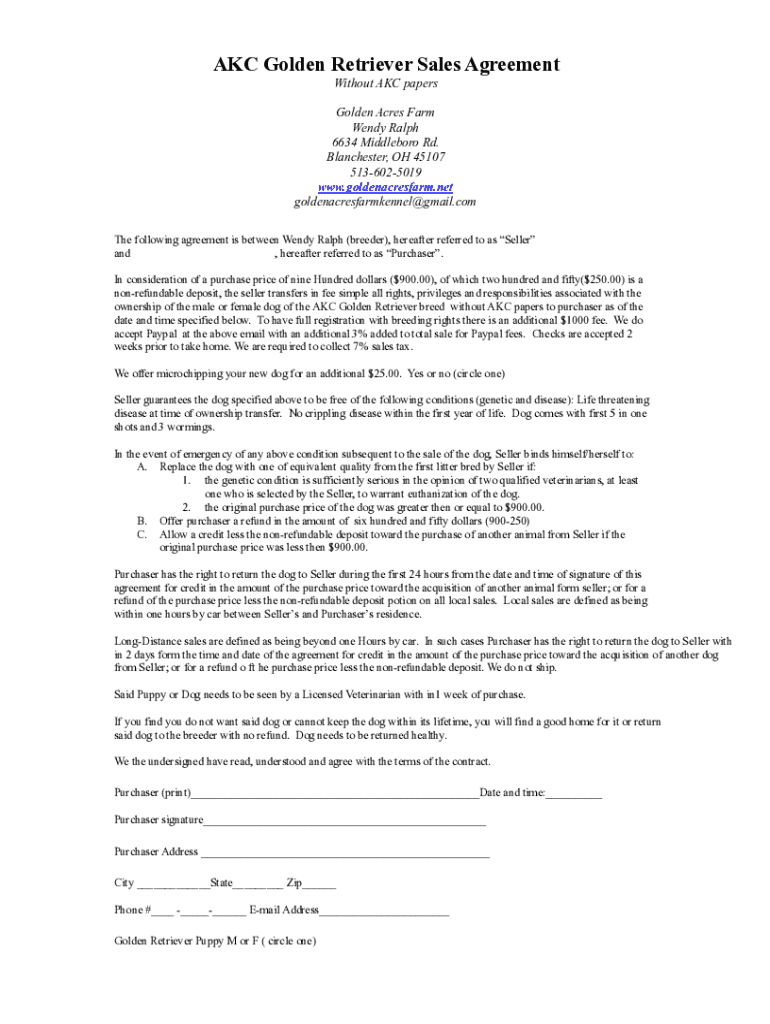 AKC Golden Retriever Sales Agreement Without AKC papers Golden Acres Farm Wendy Ralph 6634 Middlebrow Rd. Blanch ester, OH 45107 5136025019 www.goldenacresfarm.net goldenacresfarmkennel@gmail.com