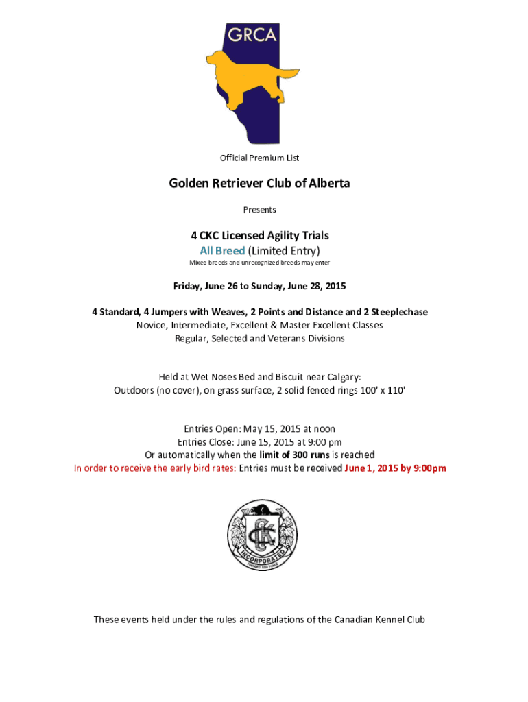 Official Premium List Golden Retriever Club of Alberta Presents4 CBC Licensed Agility Trials All Breed (Limited Entry) Mixed breeds and unrecognized breeds may enter Friday, June 26 to Sunday, June