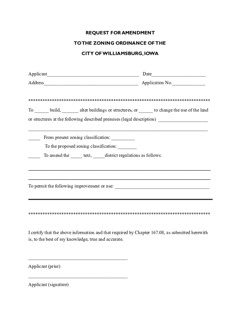REQUEST FOR AMENDMENT TO THE ZONING ORDINANCE OF THE CITY OF WILLIAMSBURG, IOWAApplicant___ Date___ Address___ Application No.___*****************************************************************************