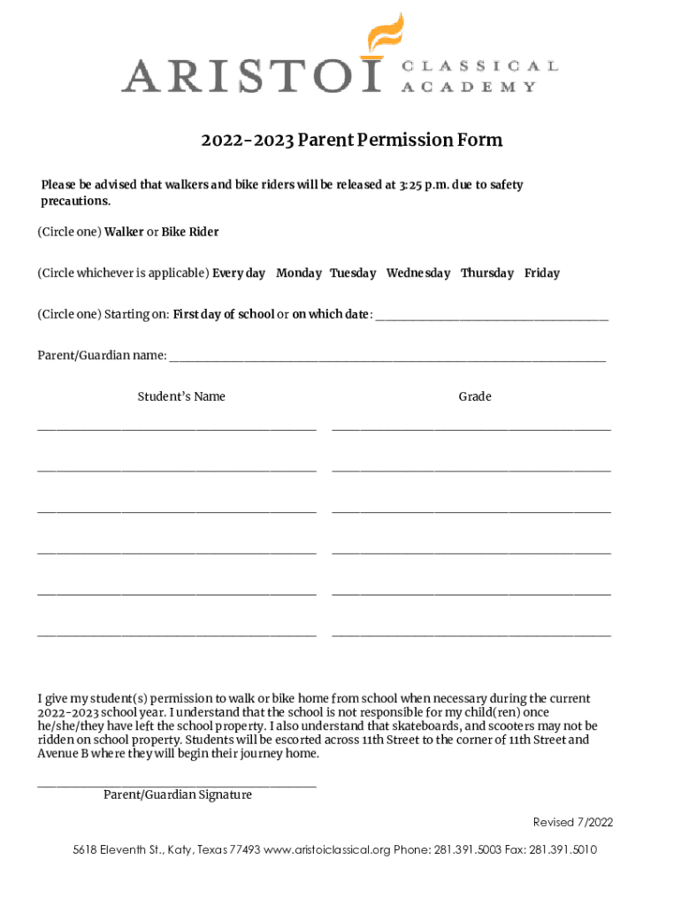 20222023 Parent Permission Form Please be advised that walkers and bike riders will be released at 3:25 p.m. due to safety precautions. (Circle one) Walker or Bike Rider (Circle whichever is applicable)