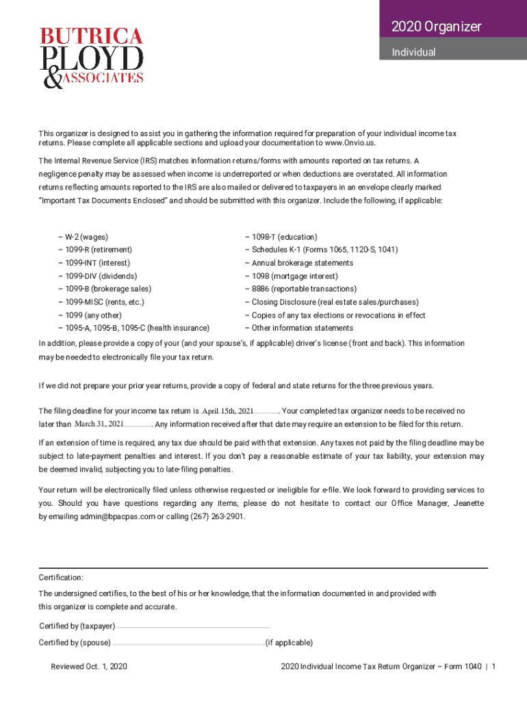 2020 Organizer Individuals organizer is designed to assist you in gathering the information required for preparation of your individual income tax returns. Please complete all applicable sections