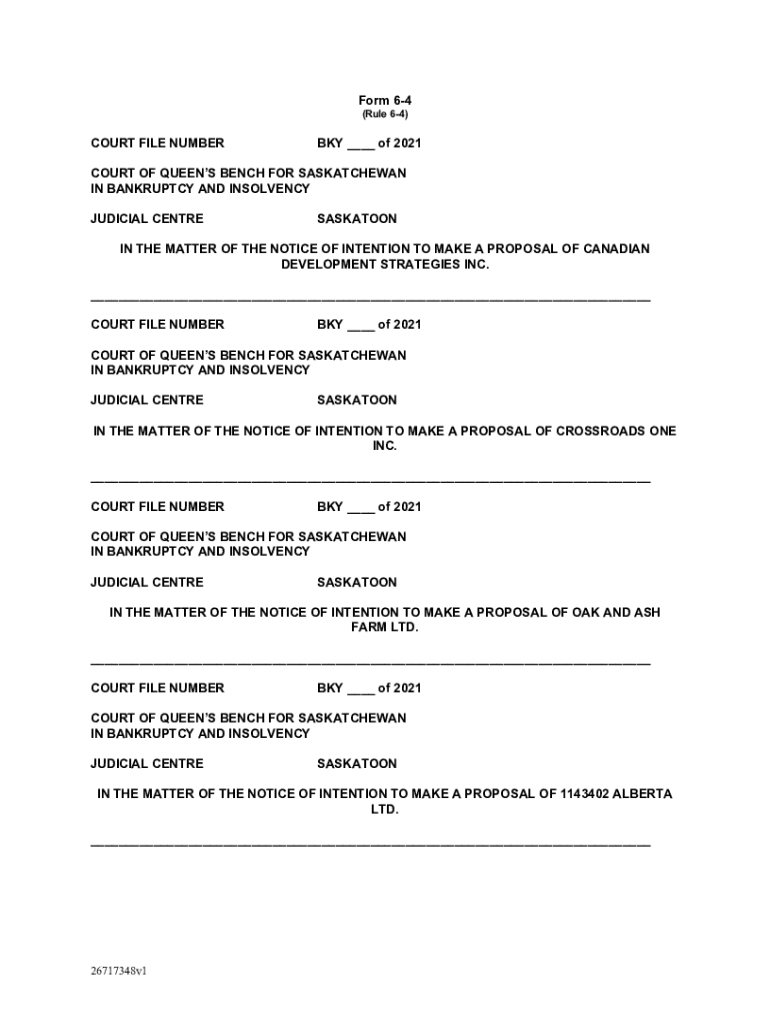 Form 64 (Rule 64)COURT FILE NUMBER BKY ___ of 2021COURT OF QUEEN'S BENCH FOR SASKATCHEWAN IN BANKRUPTCY AND INSOLVENCY JUDICIAL CENTRESASKATOONIN THE MATTER OF THE NOTICE OF INTENTION TO MAKE A PROPOSAL