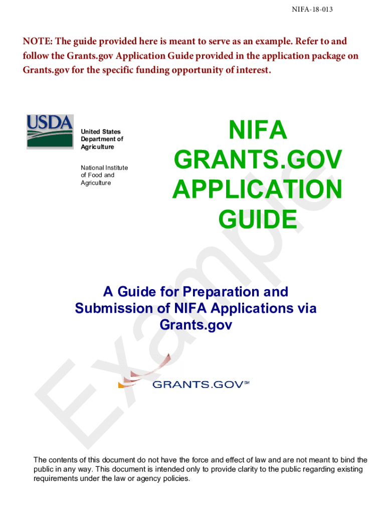 NIFA18013NOTE: The guide provided here is meant to serve as an example. Refer to and follow the Grants.gov Application Guide provided in the application package on Grants.gov for the specific funding