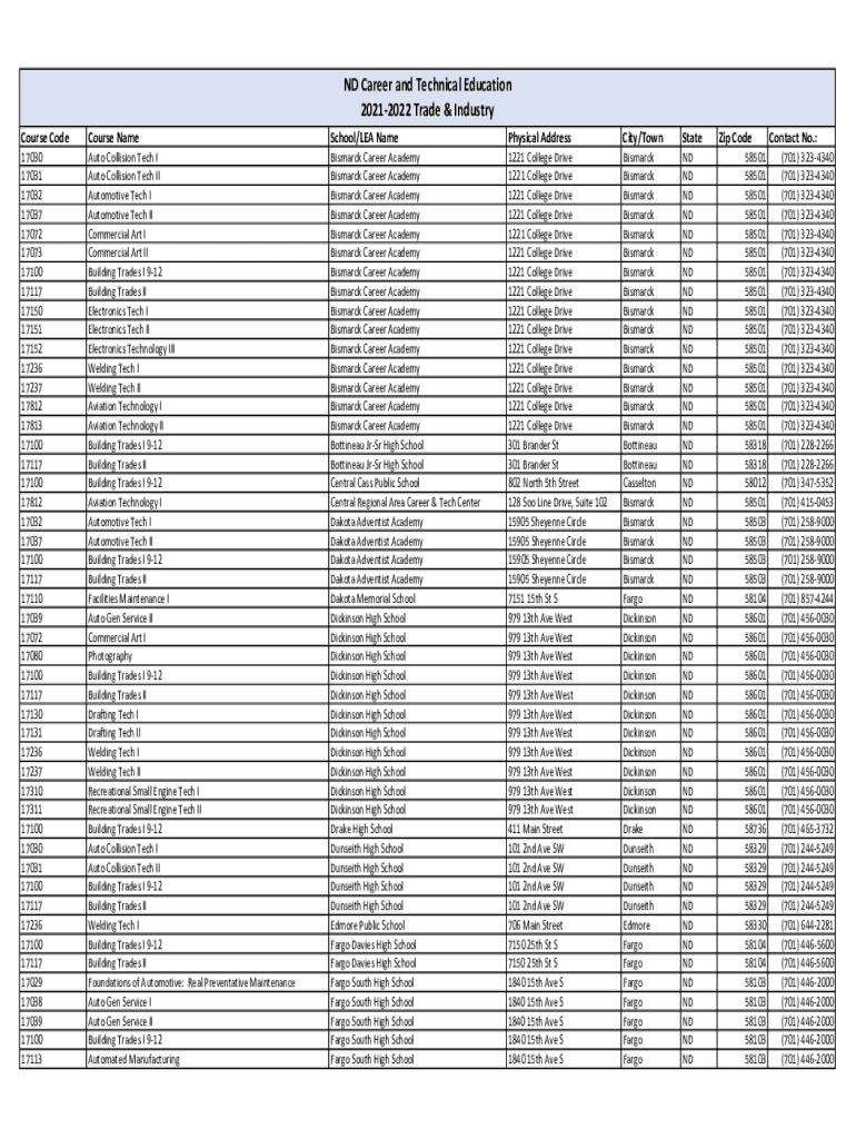 ND Career and Technical Education 20212022 Trade & Industry Course Concourse Homeschool/LEA Nonphysical Addressing/TownState17030 17031 17032 17037 17072 17073 17100 17117 17150 17151 17152 17236