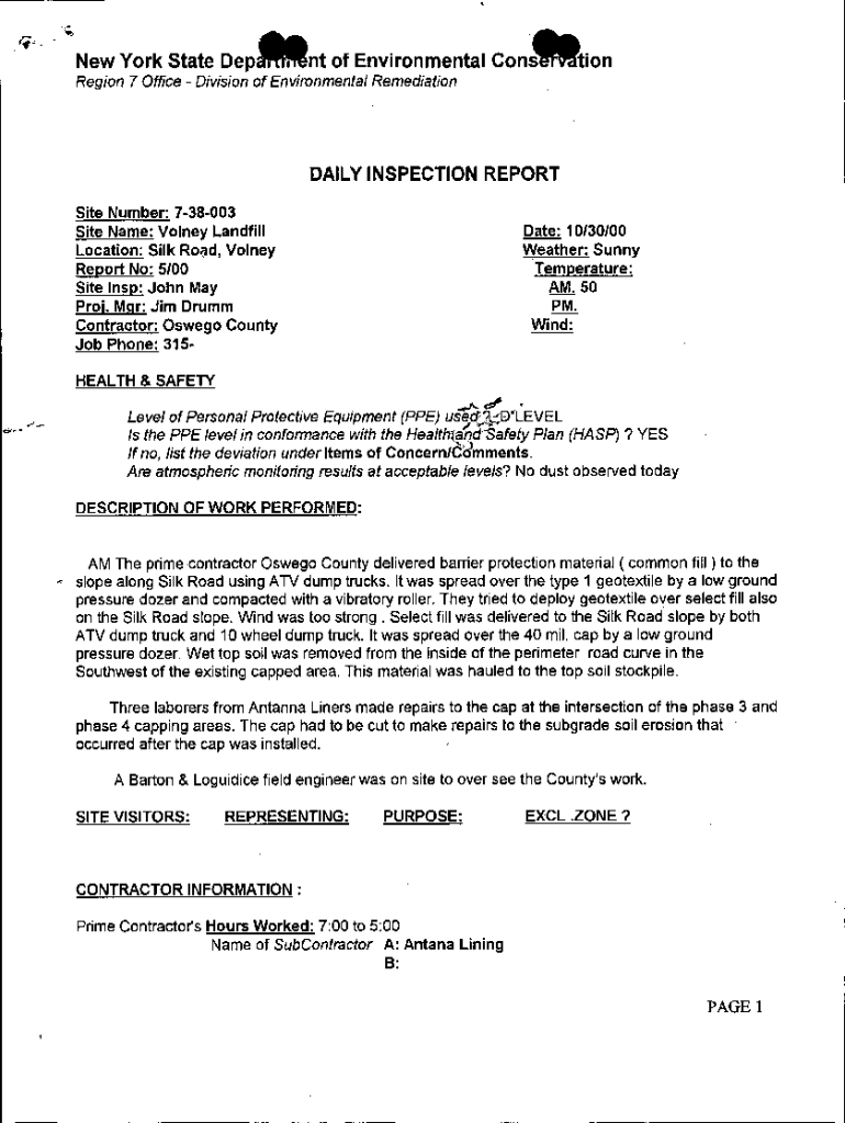 New York State D e p ^ f t n t of Environmental C o n ^ ^ FTI n Region 7 Office Division of Environmental RemediationDAILY INSPECTION REPORT Site Number: 738003 Site Name: Volley Landfill Location: