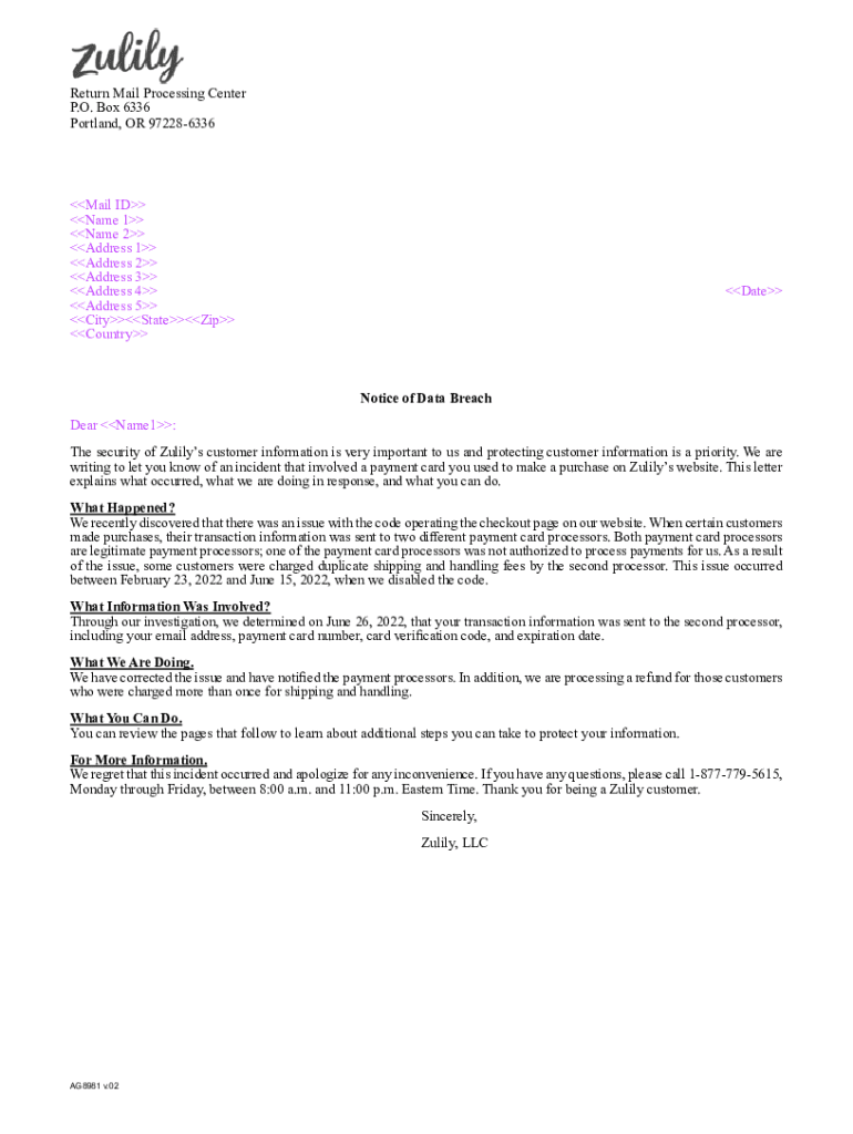 Get the free Notice of Data Breach Dear : The security of Zulily's ... - oag ca