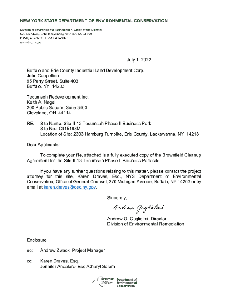 July 1, 2022, Buffalo and Erie County Industrial Land Development Corp. John Rappelling 95 Perry Street, Suite 403 Buffalo, NY 14203 Tecumseh Redevelopment Inc. Keith A. Nagel 200 Public Square, Suite