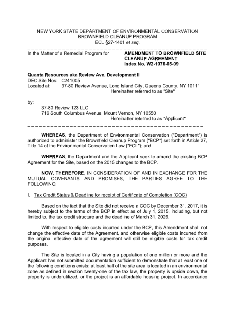 NEW YORK STATE DEPARTMENT OF ENVIRONMENTAL CONSERVATION BROWNFIELD CLEANUP PROGRAM ECL 271401 et seq. ___ In the Matter of a Remedial Program for AMENDMENT TO BROWNFIELD SITE CLEANUP AGREEMENT Index