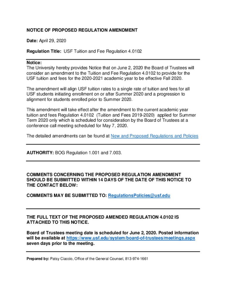 NOTICE OF PROPOSED REGULATION AMENDMENT Date: April 29, 2020, Regulation Title: USF Tuition and Fee Regulation 4.0102 Notice: The University hereby provides Notice that on June 2, 2020, the Board