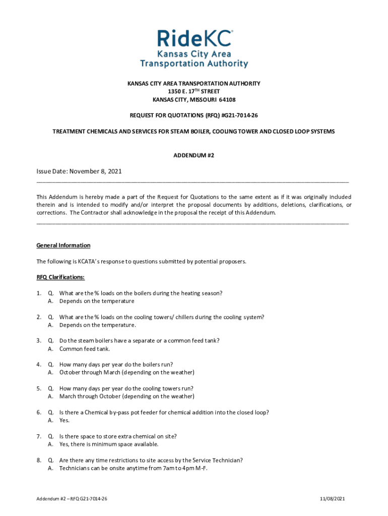 KANSAS CITY AREA TRANSPORTATION AUTHORITY 1350 E. 17TH STREET KANSAS CITY, MISSOURI 64108 REQUEST FOR QUOTATIONS (RFQ) #G21701426 TREATMENT CHEMICALS AND SERVICES FOR STEAM BOILER, COOLING TOWER AND