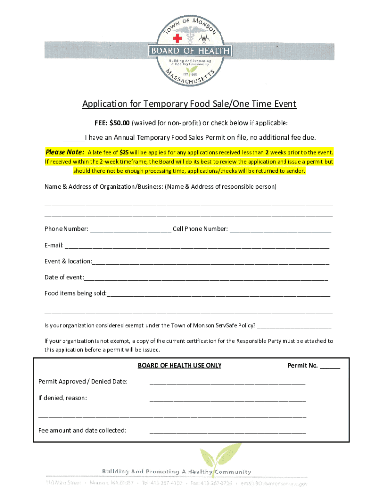 Application for Temporary Food Sale/One Time Event FEE: $50.00 (waived for nonprofit) or check below if applicable: ___I have an Annual Temporary Food Sales Permit on file, no additional fee due.