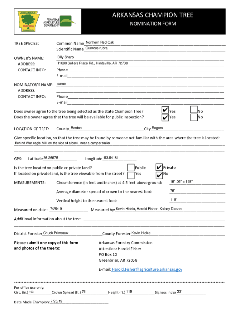 ARKANSAS CHAMPION TREE NOMINATION FORMER SPECIES:Northern Red Oak Common Name___ Quercus Aubrey Scientific Name___OWNERS NAME: ADDRESS: CONTACT INFO:Billy Sharp ___ 11690 Sellers Place Rd., Hinesville,