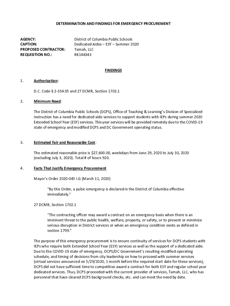 DETERMINATION AND FINDINGS FOR EMERGENCY PROCUREMENT AGENCY: CAPTION: PROPOSED CONTRACTOR: REQUISITION NO.:District of Columbia Public Schools Dedicated Aides ESY Summer 2020 Tam ah, LLC RK148343