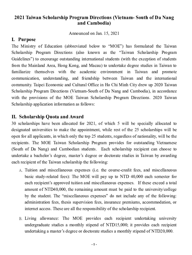 2021 Taiwan Scholarship Program Directions (Vietnam South of The Gang and Cambodia) Announced on Jan. 15, 2021I. Purpose The Ministry of Education (abbreviated below to MOE) has formulated the Taiwan