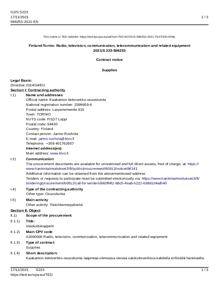 OJ/S S223 17/11/2021 5862532021EN1/3This notice in TED website: https://ted.europa.eu/udl?uriTED:NOTICE:5862532021:TEXT:EN:HTMLFinlandTornio: Radio, television, communication, telecommunication and