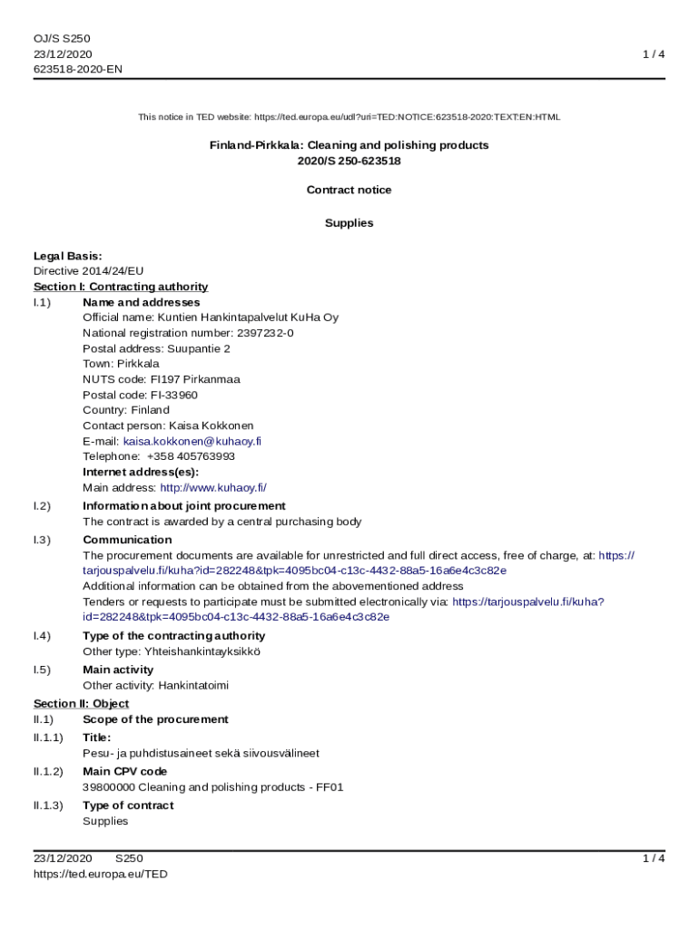 6235182020EN1/4This notice in TED website: https://ted.europa.eu/udl?uriTED:NOTICE:6235182020:TEXT:EN:HTMLFinlandPirkkala: Cleaning and polishing products