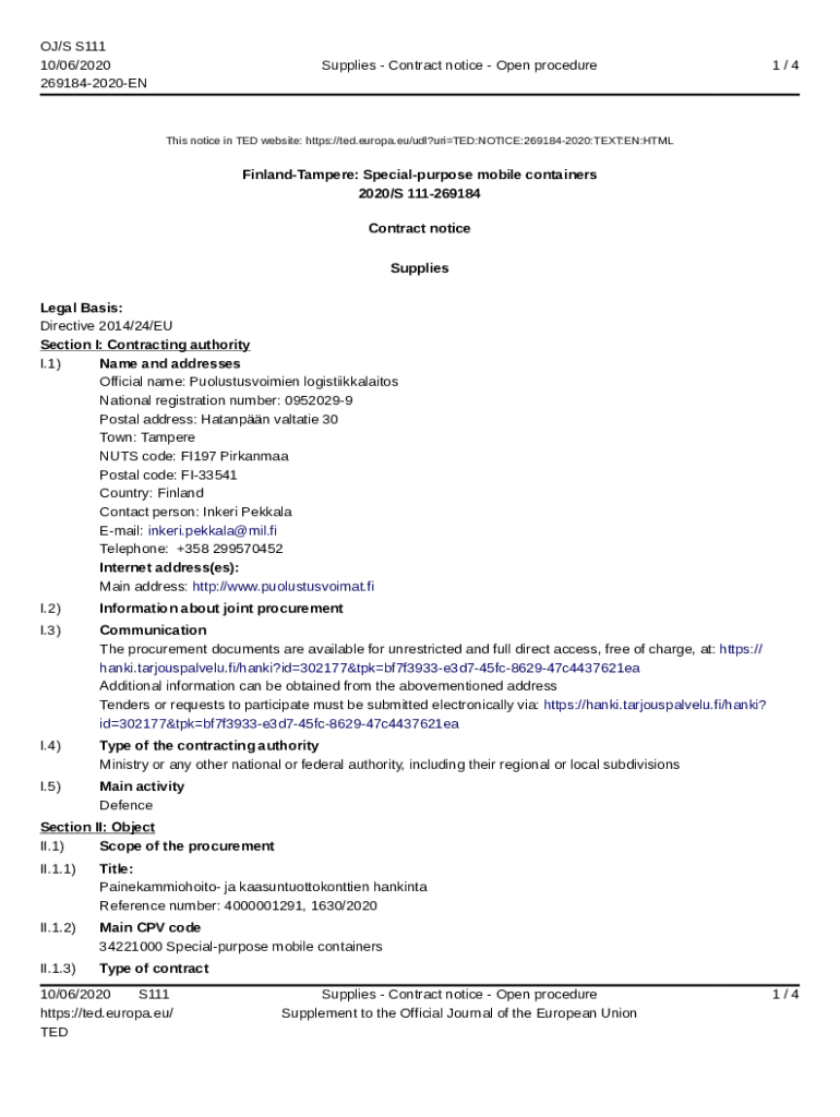 OJ/S S111 10/06/2020 2691842020ENSupplies Contract notice Open procedure1/4This notice in TED website: https://ted.europa.eu/udl?uriTED:NOTICE:2691842020:TEXT:EN:HTMLFinlandTampere: Special purpose