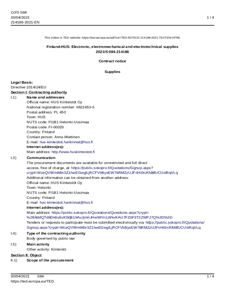 OJ/S S84 30/04/2021 2141862021EN1/4This notice in TED website: https://ted.europa.eu/udl?uriTED:NOTICE:2141862021:TEXT:EN:HTMLFinlandHUS: Electronic, electromechanical and electromechanical supplies