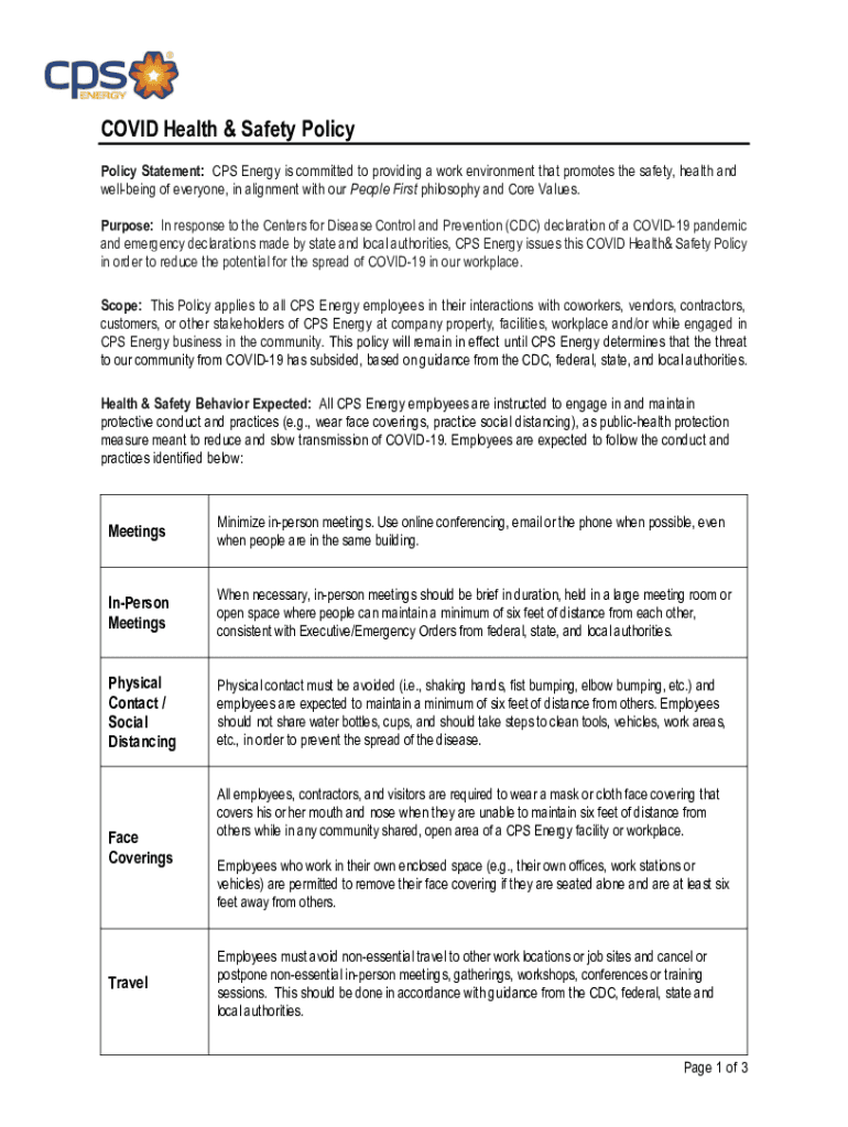 COVID-19 Health & Safety Policy Statement: CPS Energy is committed to providing a work environment that promotes the safety, health and wellbeing of everyone, in alignment with our People First philosophy