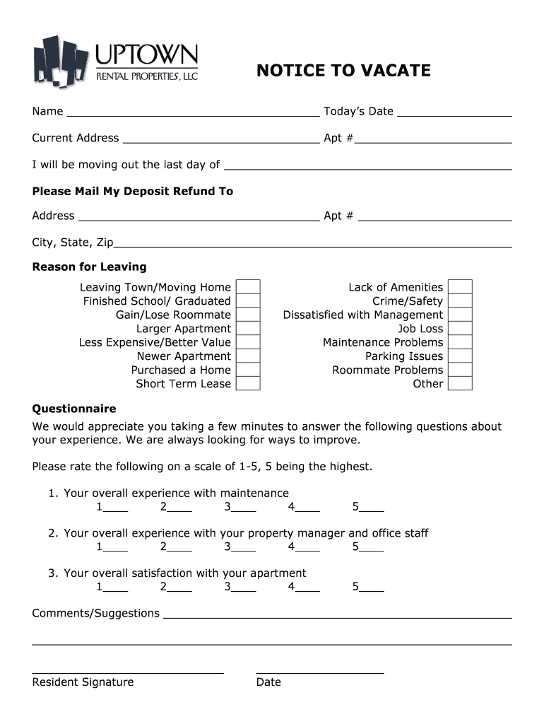 NOTICE TO VACATE Name Today's Date Current Address Apt # I will be moving out the last day of Please Mail My Deposit Refund To Address Apt # City, State, Zip Reason for Leaving Town/Moving Home Finished