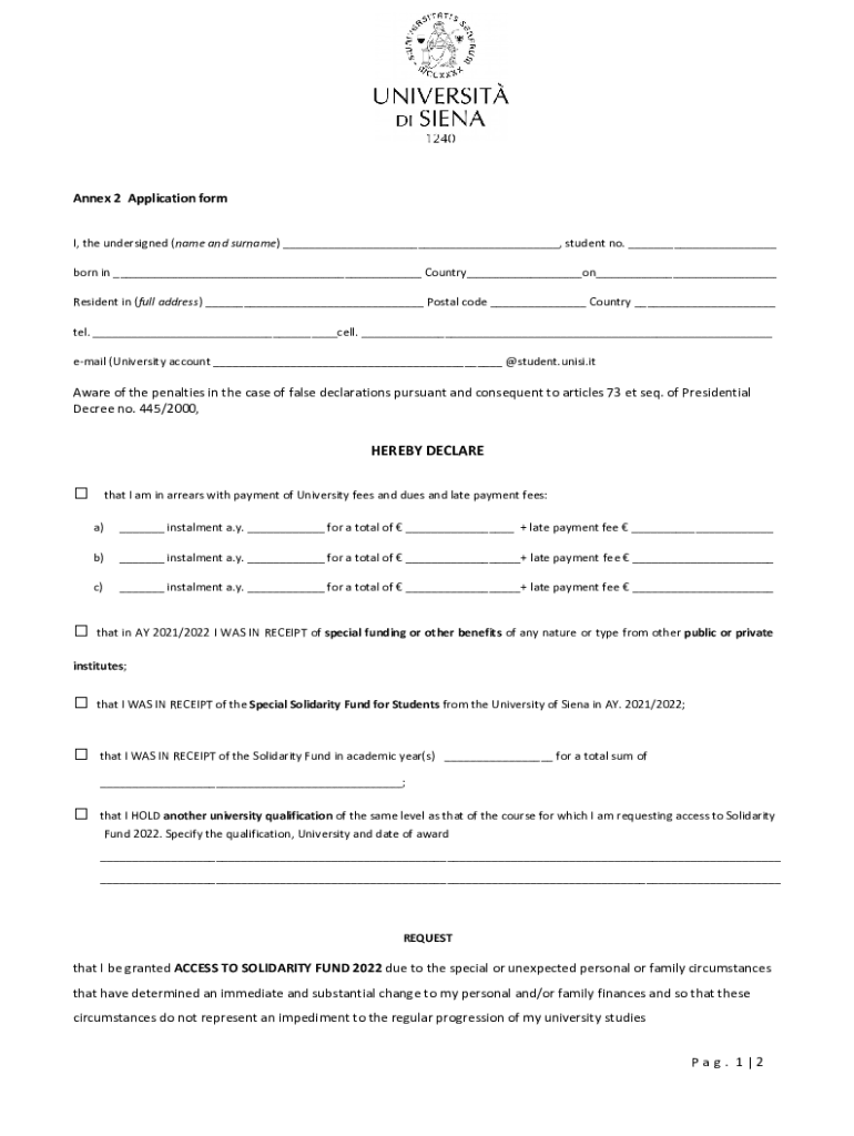 Annex 2 Application form I, the undersigned (name and surname) ___, student no. ___ born in ___ Country___on___ Resident in (full address) ___ Postal code ___ Country ___ tel. ___cell. ___ email (University