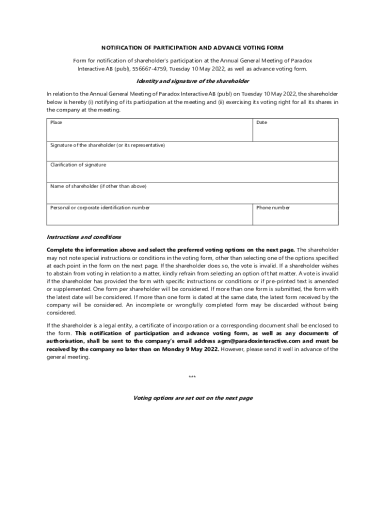NOTIFICATION OF PARTICIPATION AND ADVANCE VOTING FORM for notification of shareholders participation at the Annual General Meeting of Paradox Interactive AB (pub), 5566674759, Tuesday 10 May 2022,