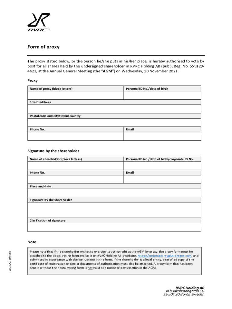 Form of proxy The proxy stated below, or the person he/she puts in his/her place, is hereby authorized to vote by post for all shares held by the undersigned shareholder in RRC Holding AB (pub), Reg.