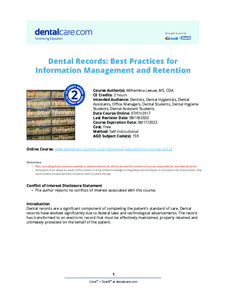 Brought to you continuing EducationDental Records: Best Practices for Information Management and Retention Course Author(s): Wilhelmina Lee, MS, CDA CE Credits: 2 hours Intended Audience: Dentists,