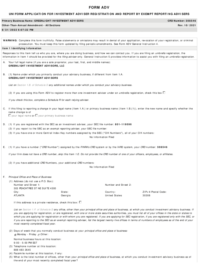 Get the free Primary Business Name: GREENLIGHT INVESTMENT ADVISORS