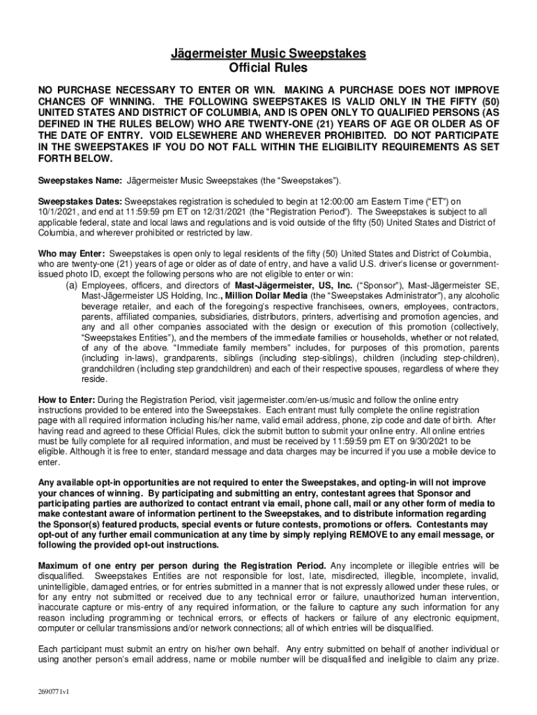 Overmaster Music Sweepstakes Official Rules NO PURCHASE NECESSARY TO ENTER OR WIN. MAKING A PURCHASE DOES NOT IMPROVE CHANCES OF WINNING. THE FOLLOWING SWEEPSTAKES IS VALID ONLY IN THE FIFTY (50)