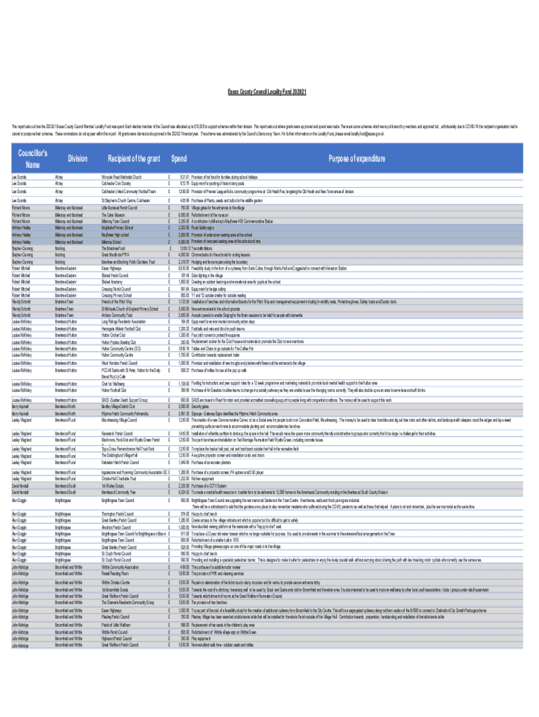 Essex County Council Locality Fund 2020/21This report sets out how the 2020/21 Essex County Council Member Locality Fund was spent. Each elected member of the Council was allocated up to 10,000 to