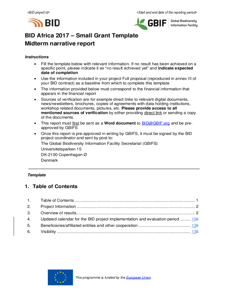 BID project start and end date of the reporting period BID Africa 2017 Small Grant Template Midterm narrative report Instructions Fill the template below with relevant information. If no result has