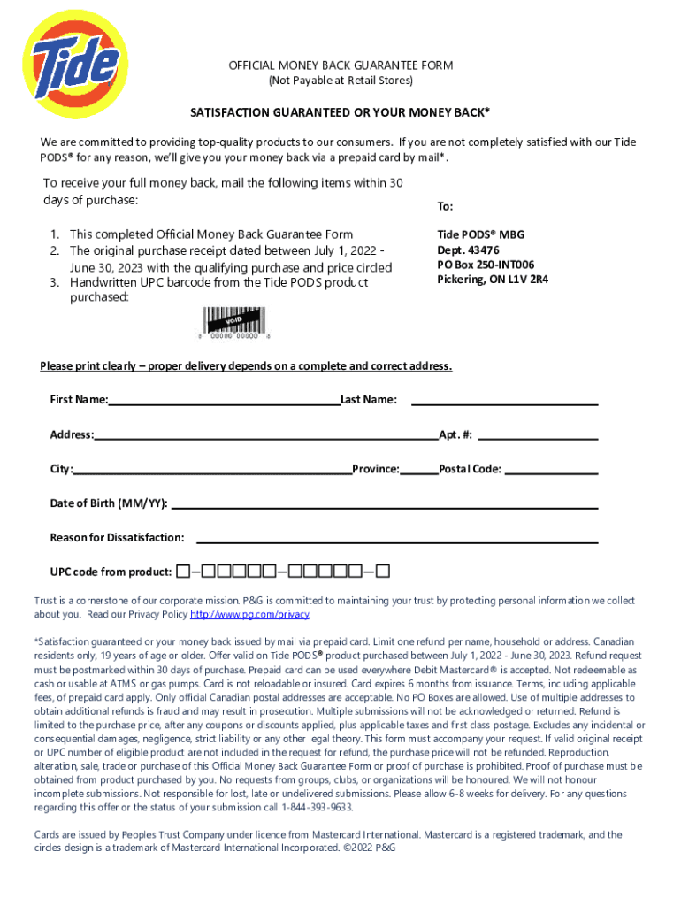 OFFICIAL MONEY-BACK GUARANTEE FORM (Not Payable at Retail Stores)SATISFACTION GUARANTEED OR YOUR MONEY BACK* We are committed to providing top quality products to our consumers. If you are not completely