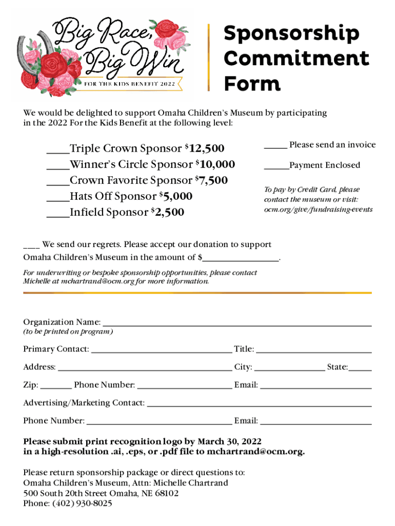 Sponsorship Commitment Form We would be delighted to support Omaha Children's Museum by participating in the 2022 For the Kids Benefit at the following level:Triple Crown Sponsor $12,500 Winners Circle