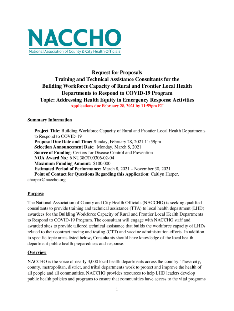 Request for Proposals Training and Technical Assistance Consultants for the Building Workforce Capacity of Rural and Frontier Local Health Departments to Respond to COVID-19 Program Topic: Addressing