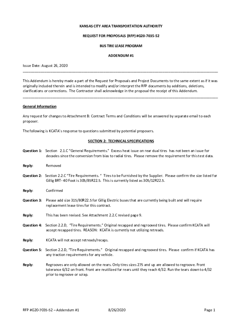 KANSAS CITY AREA TRANSPORTATION AUTHORITY REQUEST FOR PROPOSALS (RFP) #G20703552 BUS TIRE LEASE PROGRAM ADDENDUM #1 Issue Date: August 26, 2020 ___ This Addendum is hereby made a part of the Request