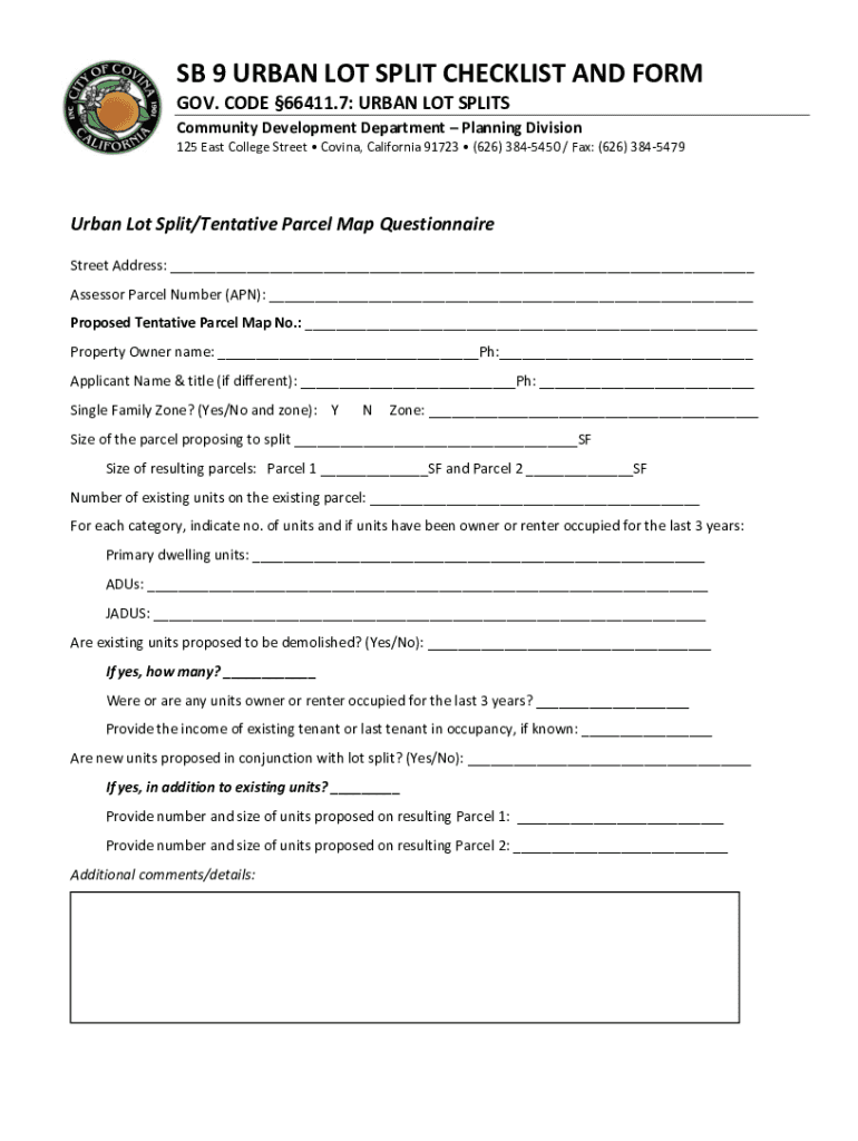 SB 9 URBAN LOT SPLIT CHECKLIST AND FORM GOV. CODE 66411.7: URBAN LOT SPLITS Community Development Department Planning Division 125 East College Street Corina, California 91723 (626) 3845450 / Fax: