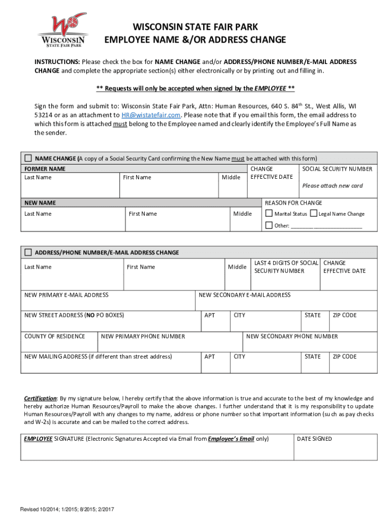 WISCONSIN STATE FAIR PARK EMPLOYEE NAME &/OR ADDRESS CHANGE INSTRUCTIONS: Please check the box for NAME CHANGE and/or ADDRESS/PHONE NUMBER/EMAIL ADDRESS CHANGE and complete the appropriate section(s)