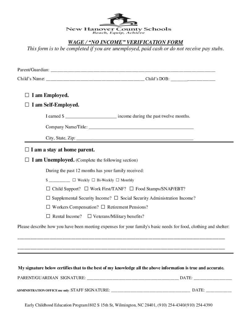 WAGE / NO INCOME VERIFICATION From This form is to be completed if you are unemployed, paid cash or do not receive pay stubs. Parent/Guardian: ___ Child's Name: ___ Child's DOB: ___ I am Employed.